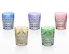 Set of five Whiskey Glasses of crystal glass in five colors decorated with Edo Kiriko. This beautiful set is a new design named "Drape & Tetragonal Basket Weave", where you can feel both Japan through Edo Kiriko patterns and the occidental through outstanding cut.